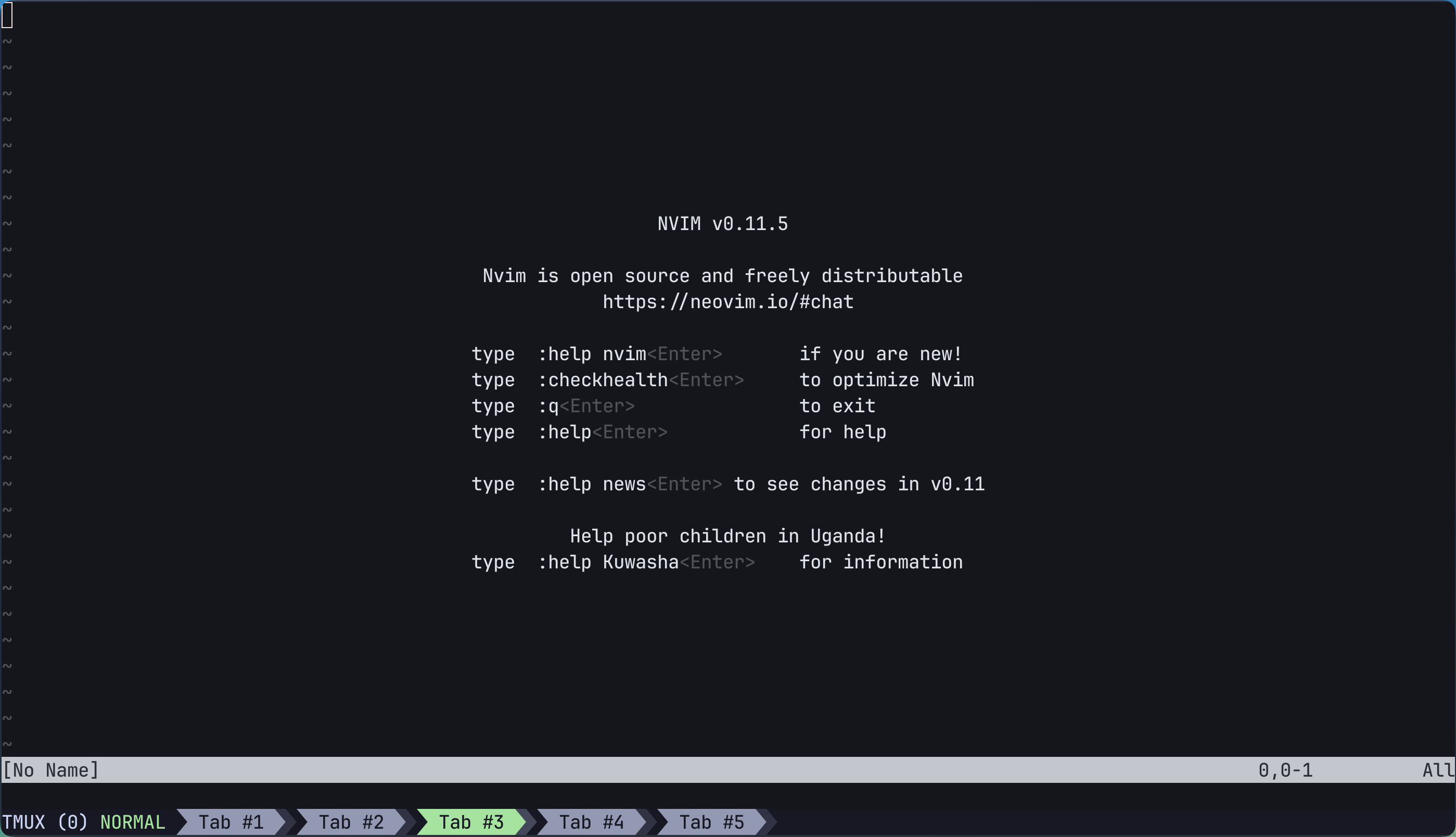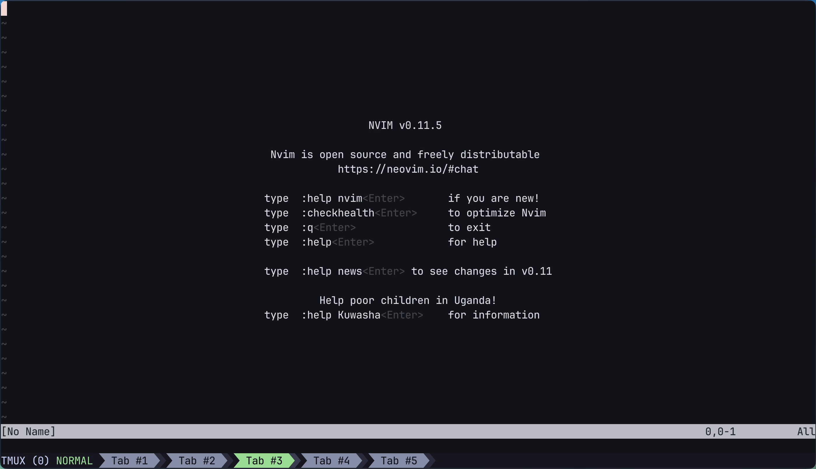 打开终端应用程序,并在其中输入 nvim 命令并运行,以打开Neovim界面, 默认的欢迎界面应该是以下这样: