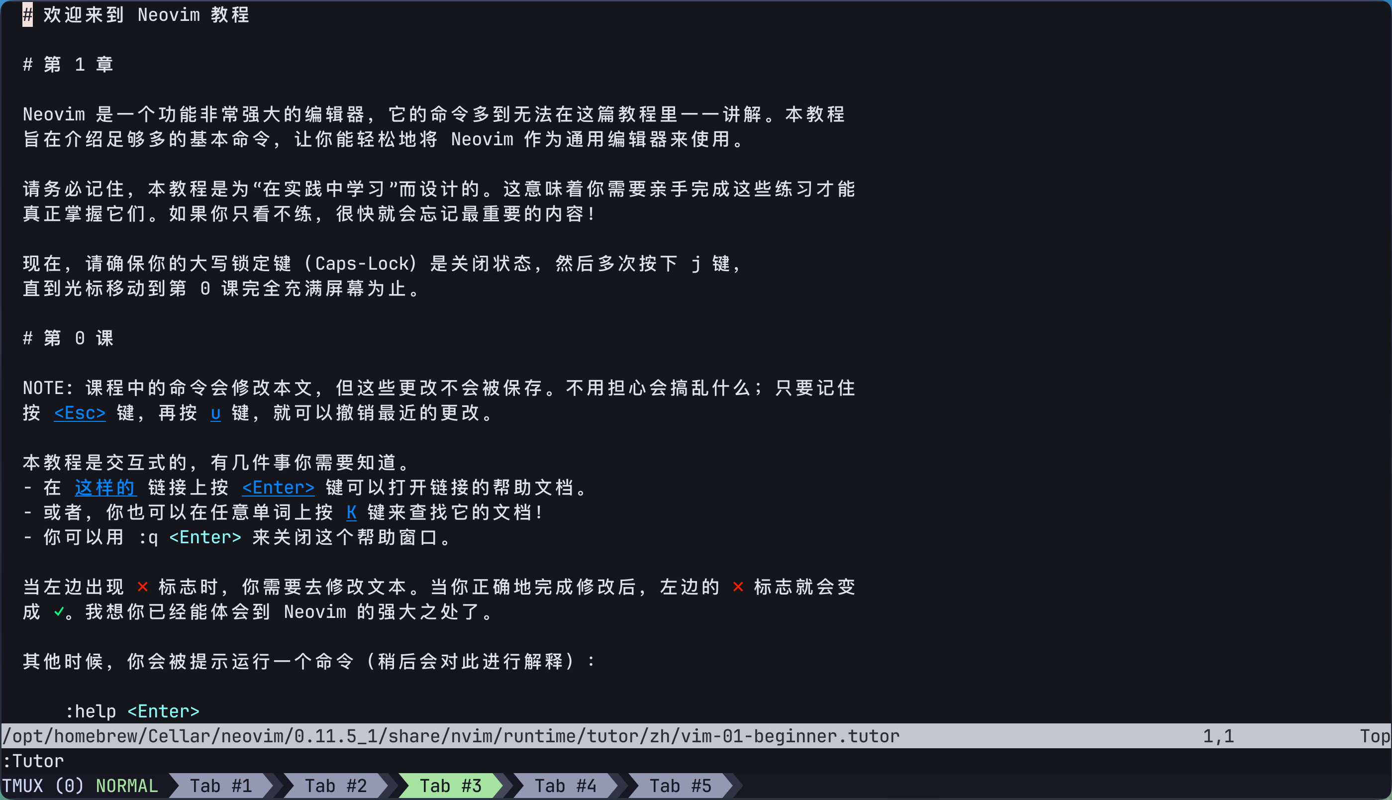 这个交互式教程是一个非常好的开始,请完整的阅读并按照教程中的指示进行操作,你将在这个教程中学习Neovim最基本也是最常用的操作。